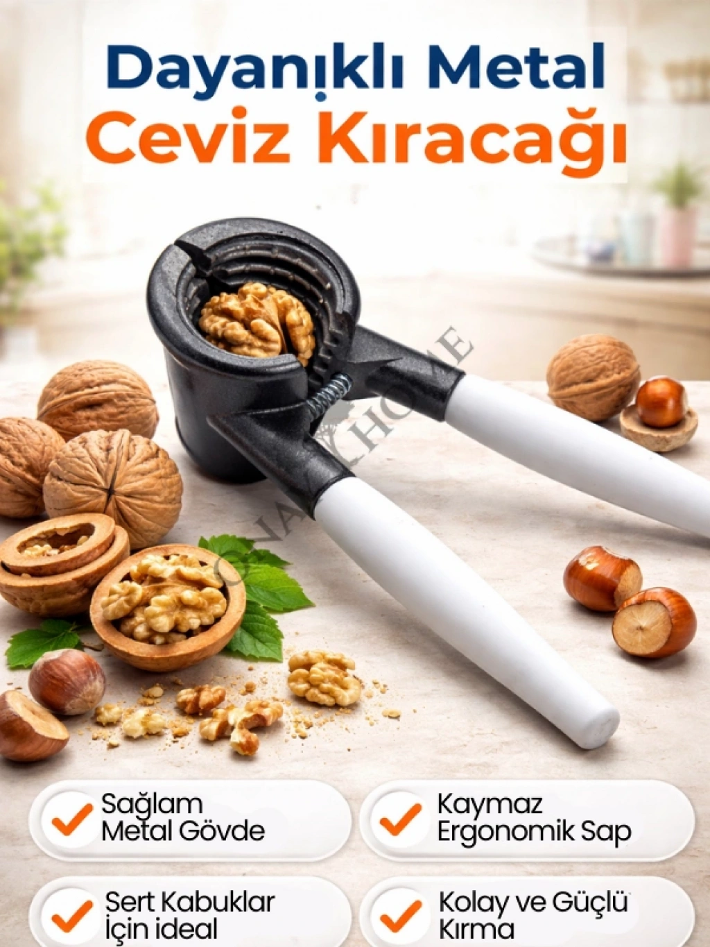 Mutfakta pratiklik ve güç bir arada! Dayanıklı metal gövdesi sayesinde ceviz, fındık, badem ve benzeri sert kabuklu kuruyemişleri zorlanmadan ve dağılmadan kırmanızı sağlar. Ergonomik ve kaymaz sapları sayesinde el yormaz, güvenli kullanım sunar.