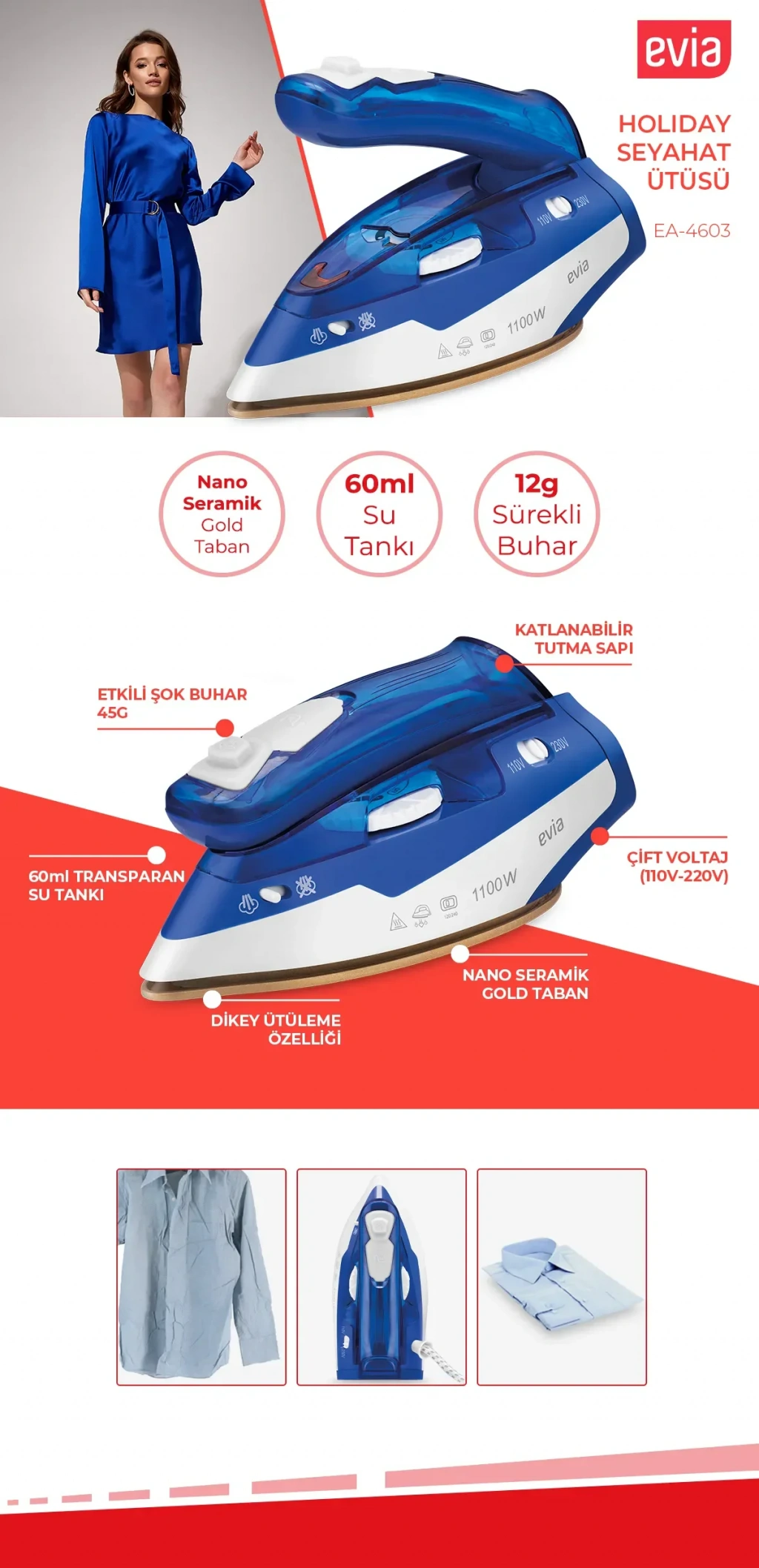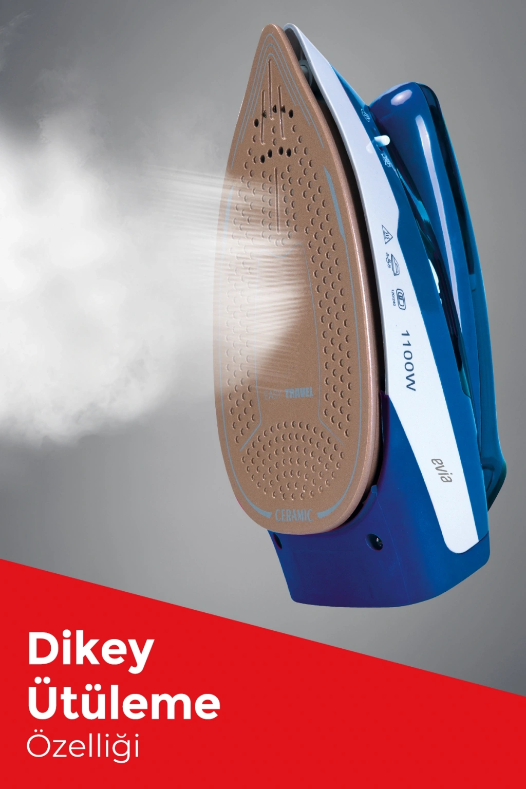 Evia Holiday Seramik Tabanlı Etkili Şok Buharlı Katlanabilir Dikey Ütüleme Özellikli Seyahat Ütüsü EA-4603