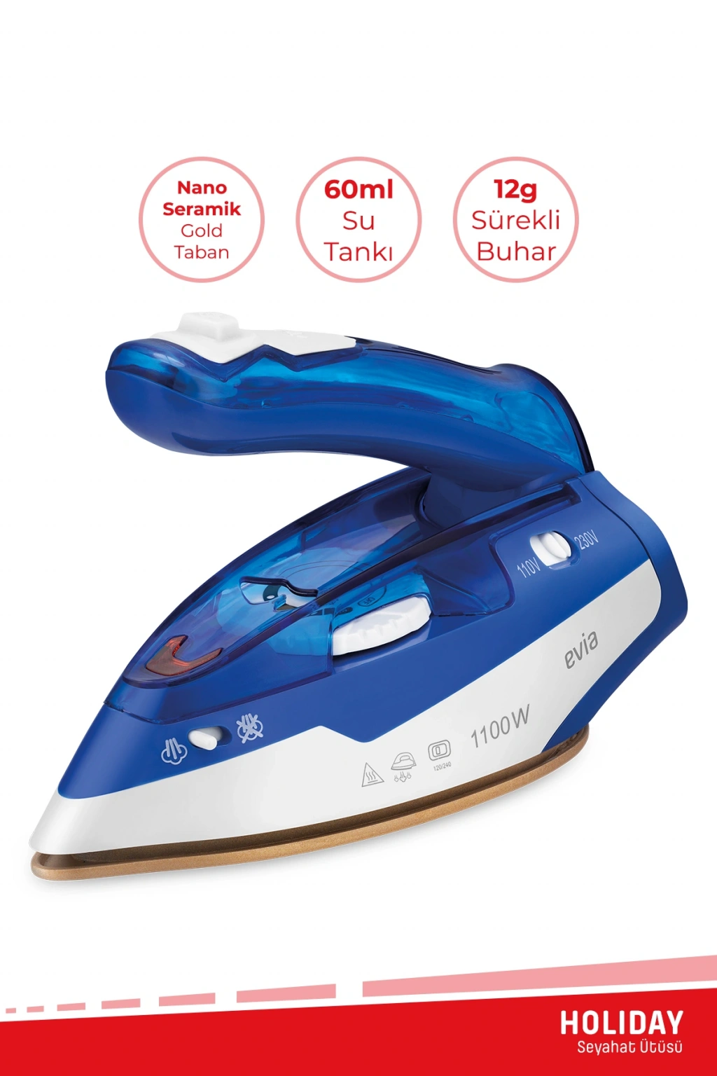 Evia Holiday Seramik Tabanlı Etkili Şok Buharlı Katlanabilir Dikey Ütüleme Özellikli Seyahat Ütüsü