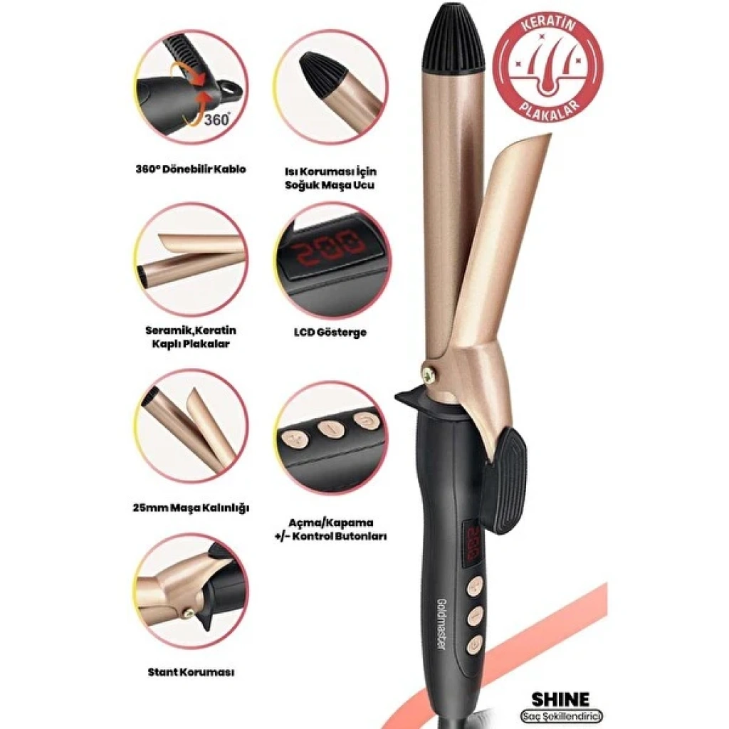 GoldMaster Shine Dijital Göstergeli Seramik Plakalı 25 mm Saç Şekillendirici Maşa Gold IN6136